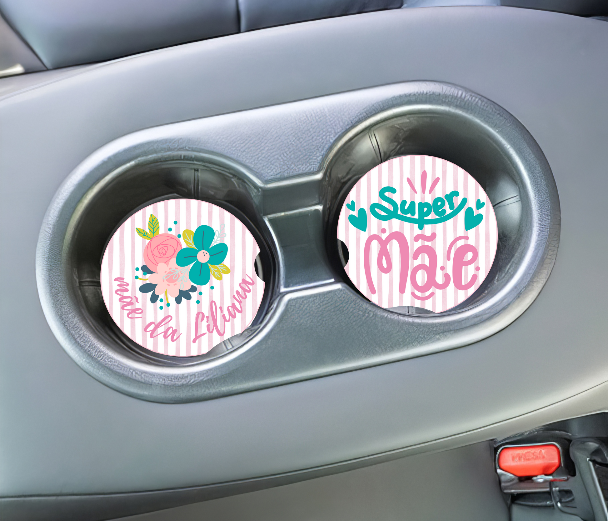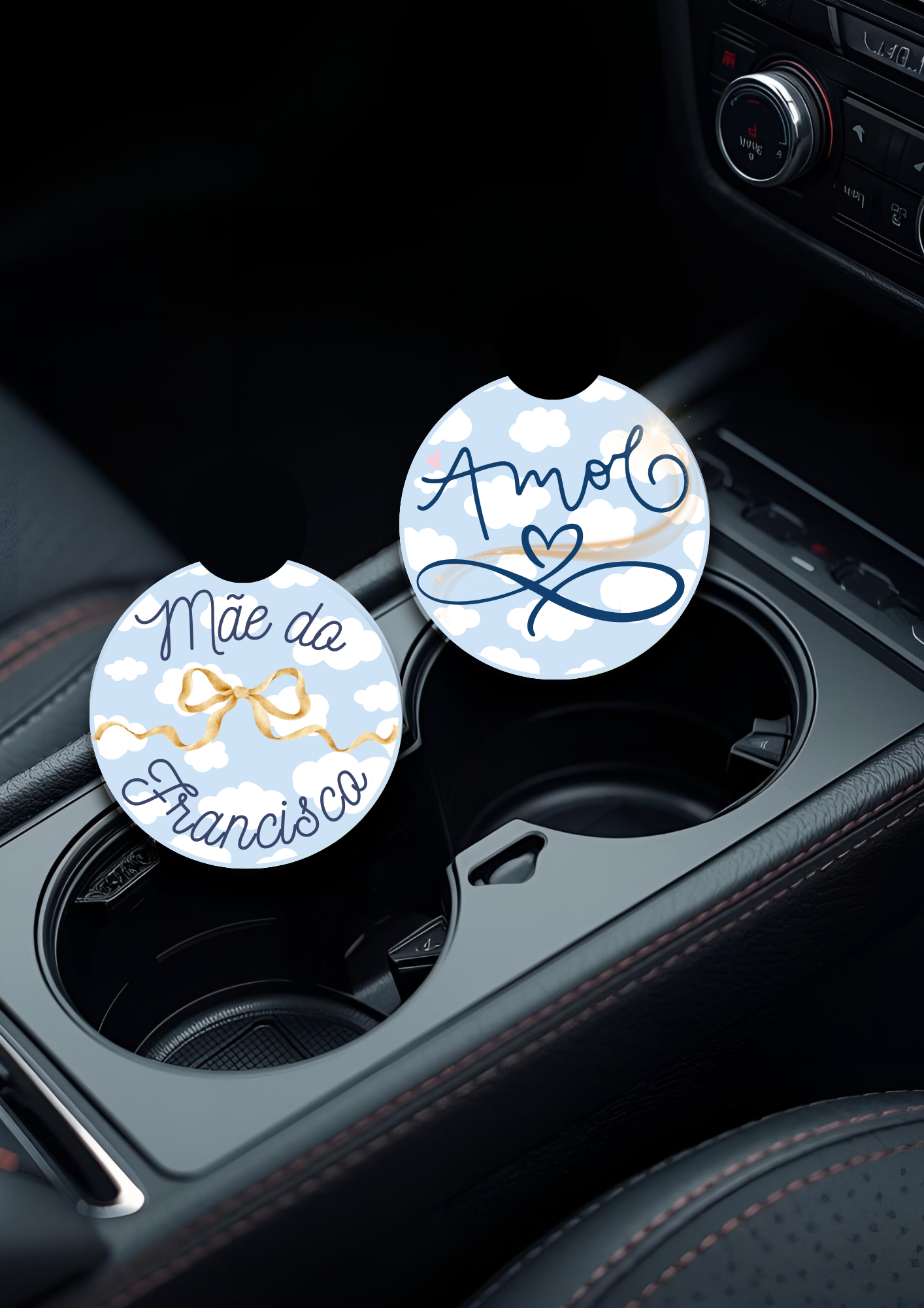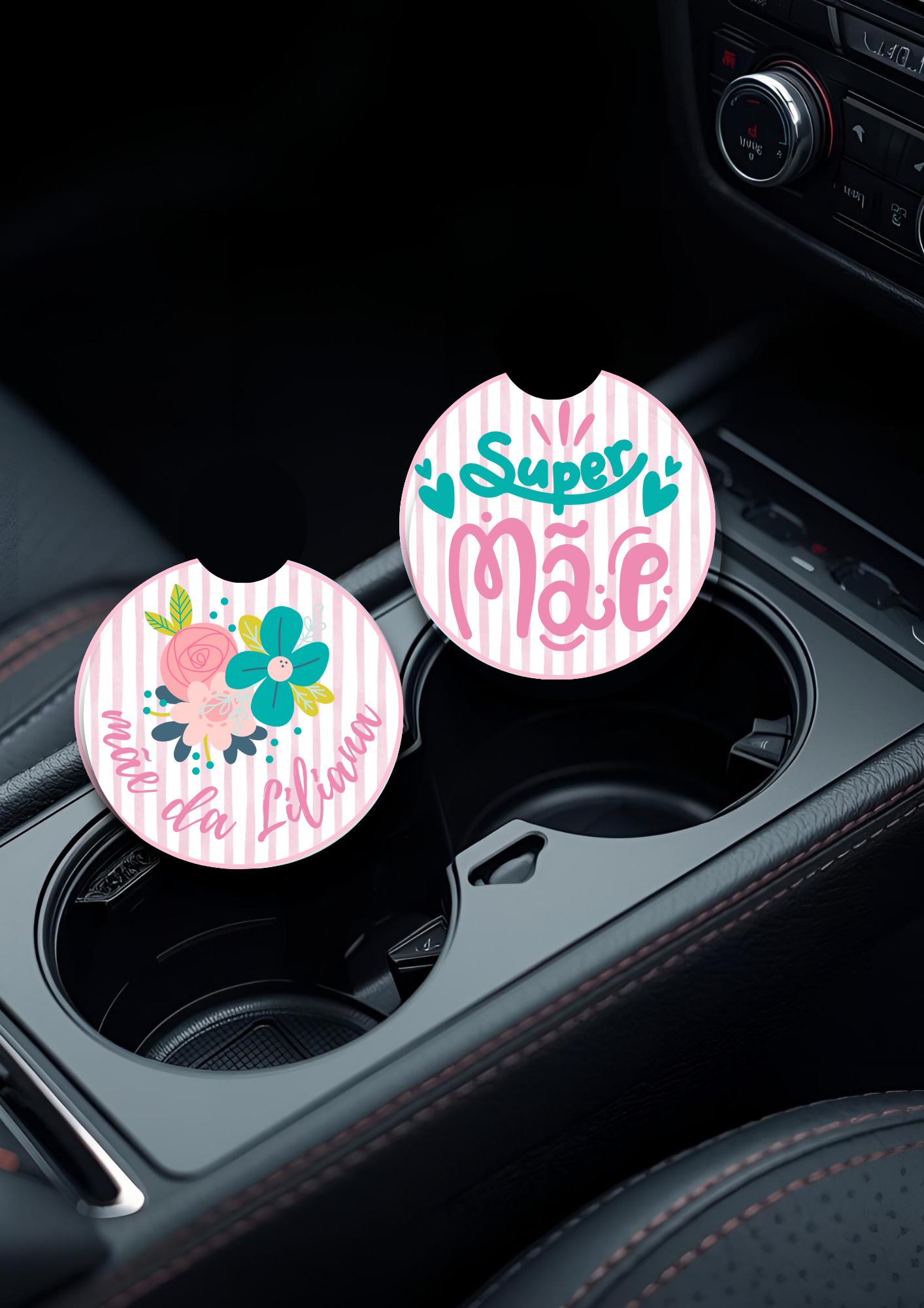 Estas bases de copos para carro personalizadas são gravadas com o nome dos filhos, criando um detalhe exclusivo que une funcionalidade e emoção.
