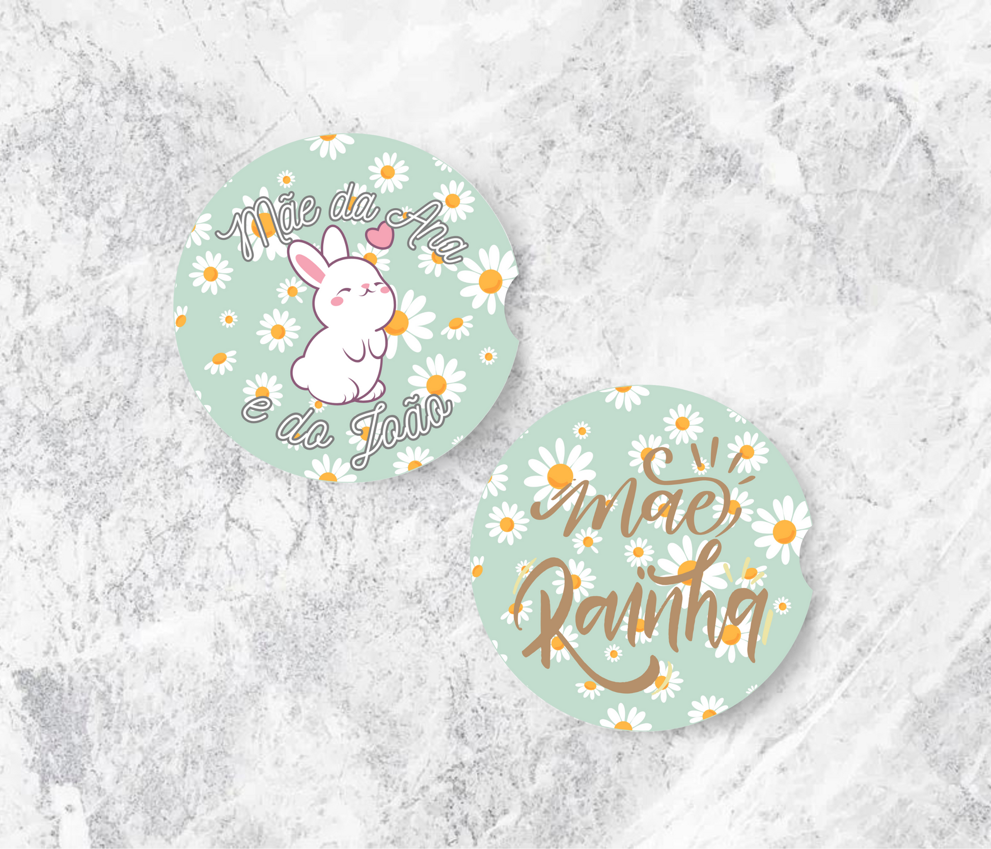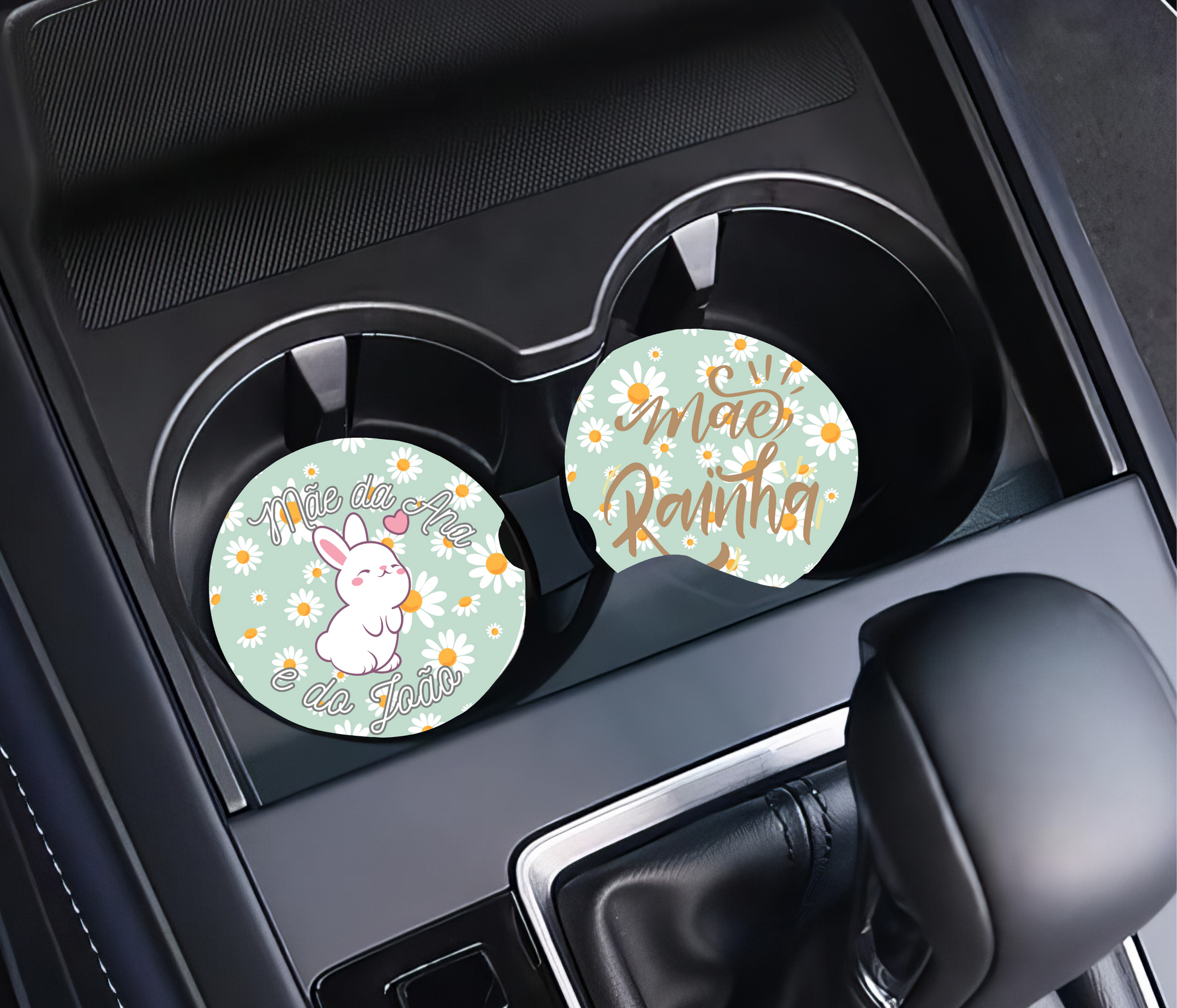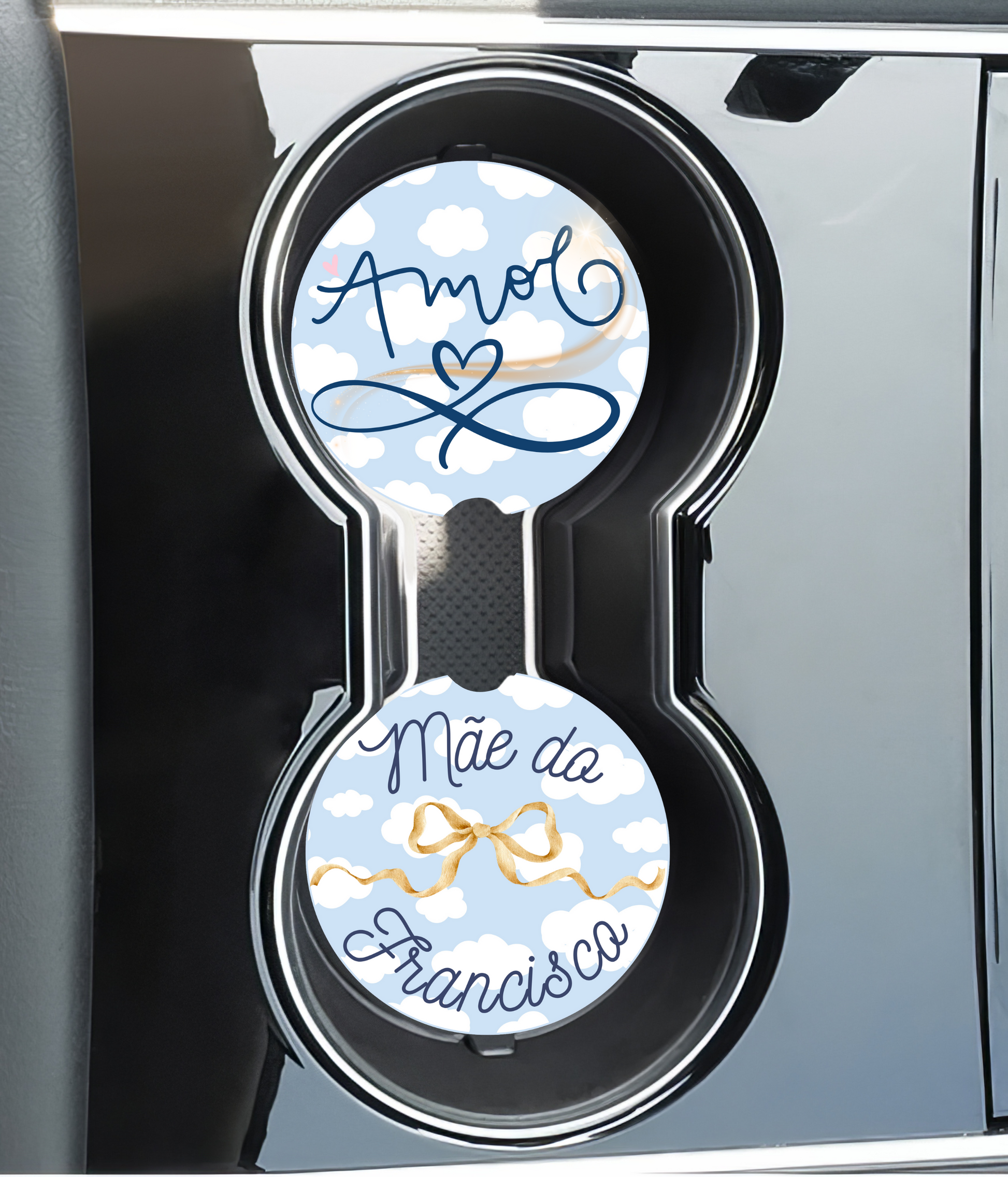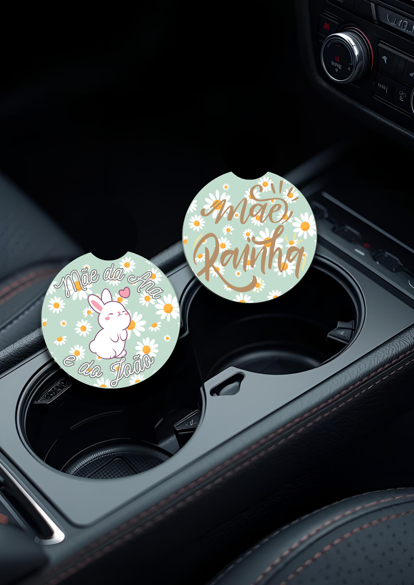 Estas bases de copos para carro personalizadas são gravadas com o nome dos filhos, criando um detalhe exclusivo que une funcionalidade e emoção.