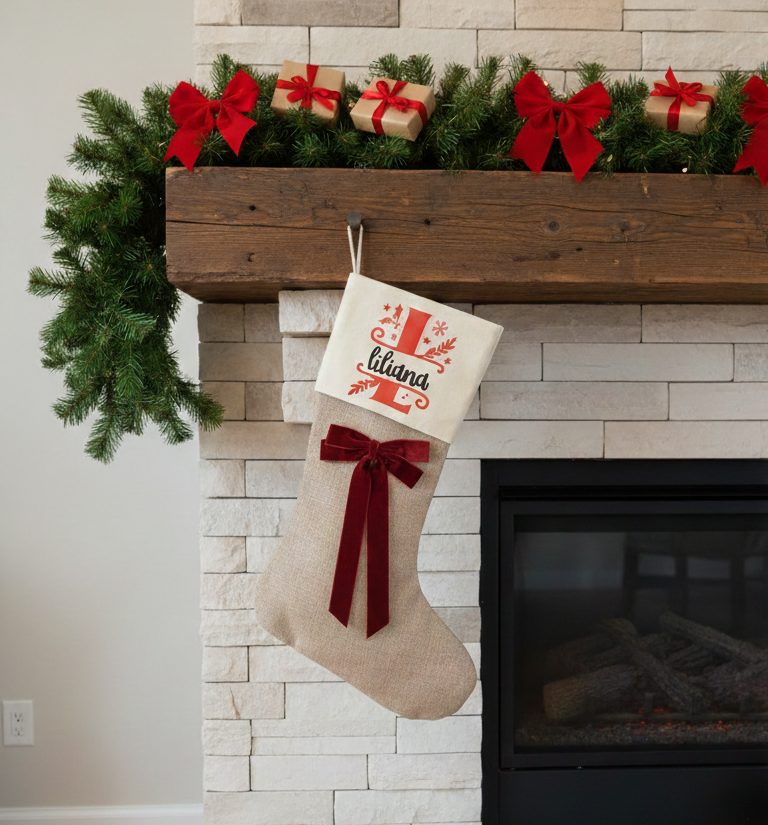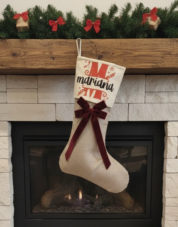 Celebre o seu Natal com esta bota personalizada com o seu nome e um laço perfeito, ideal para receber os seus presentes e guardar como recordação especial da época natalícia!