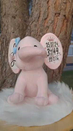 O nosso elefante de peluche personalizado é suave, fofinho e especial: nas suas grandes orelhas, gravamos o nome da criança de um lado e, do outro, as estatísticas de nascimento (data, hora, peso e altura).